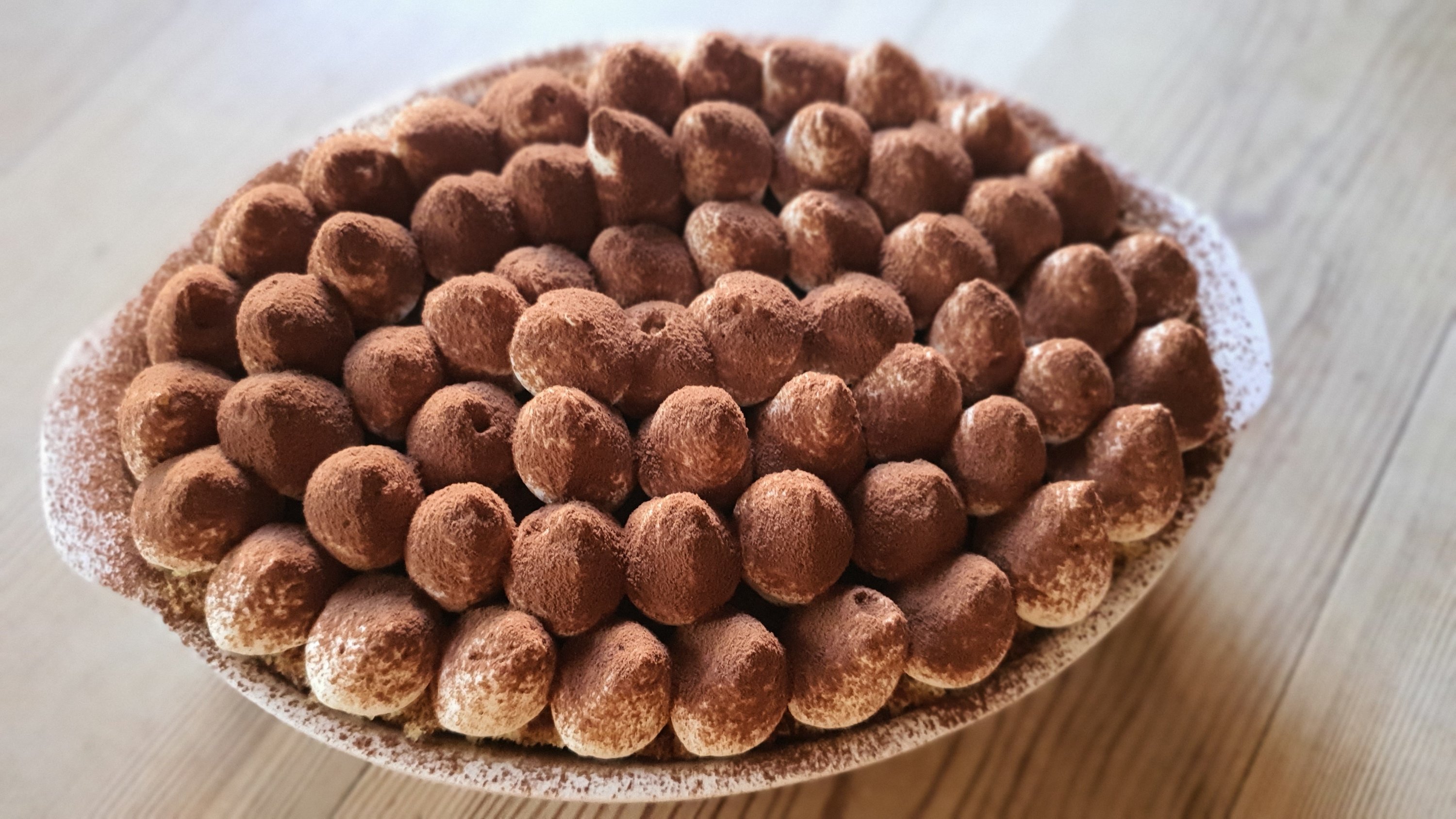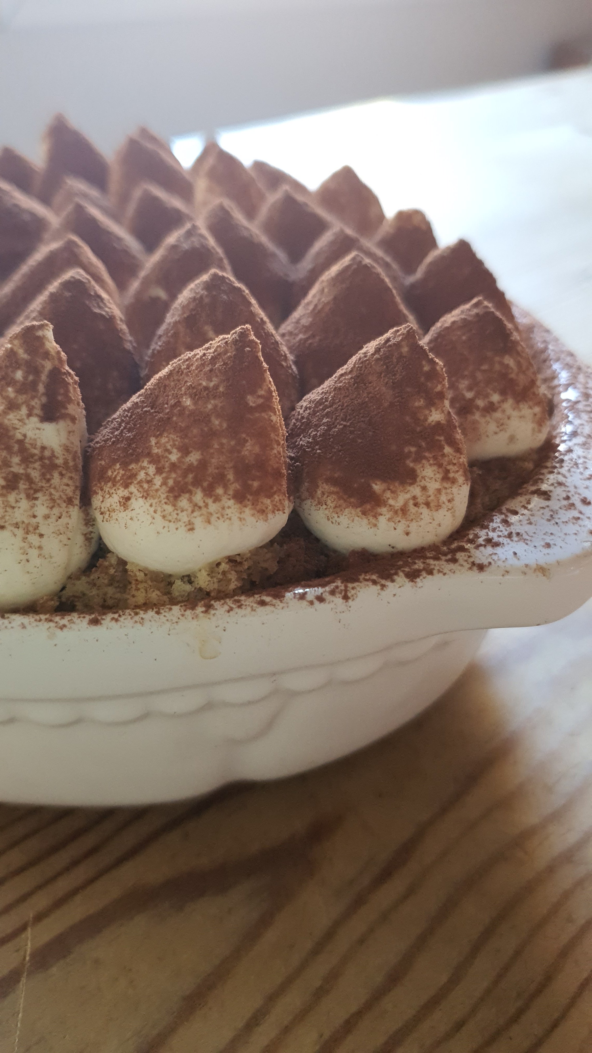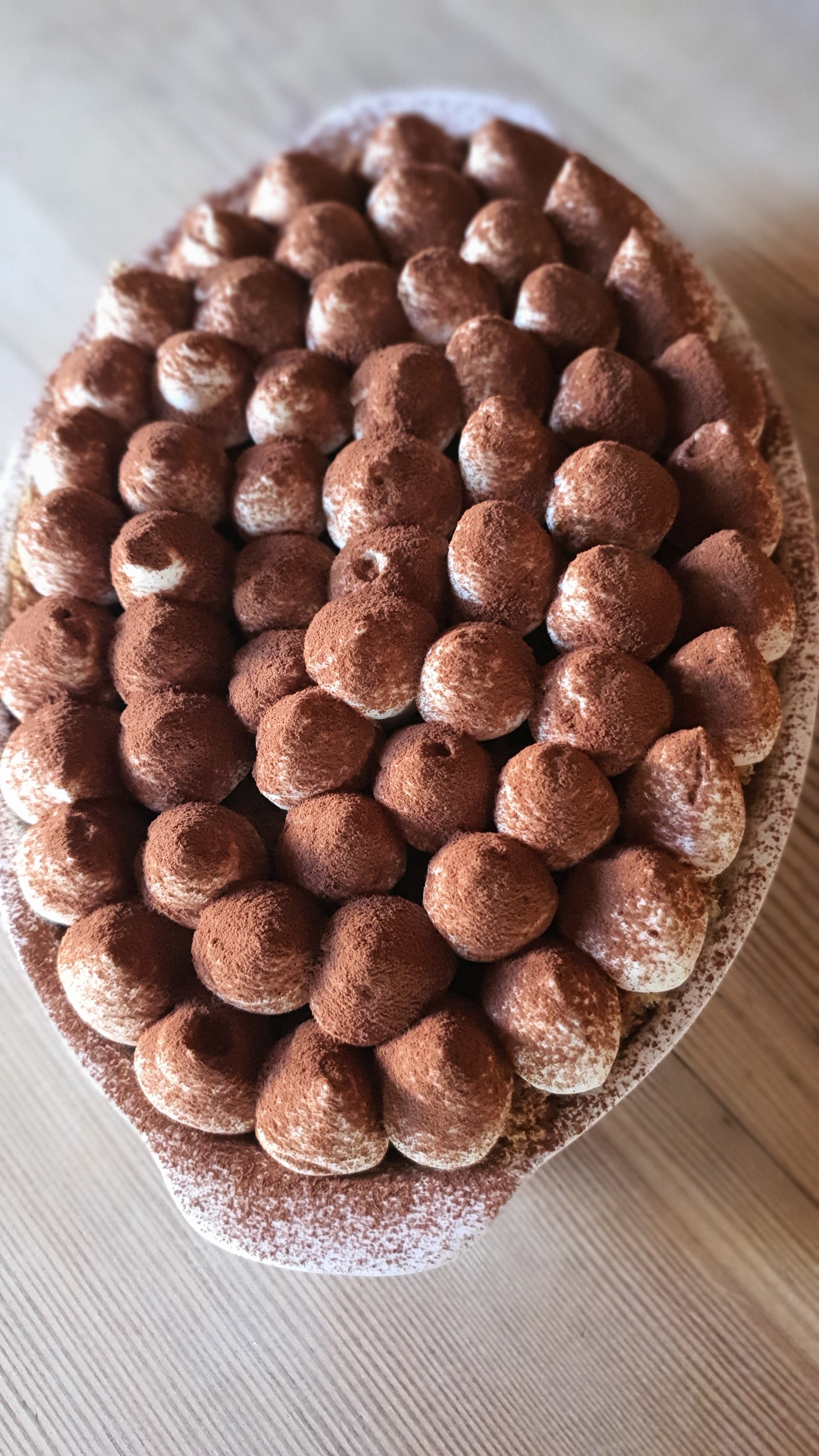 Versate la rimanente crema al mascarpone in una sac à poche e decorate la superficie del dolce con dei piccoli ciuffetti di crema.