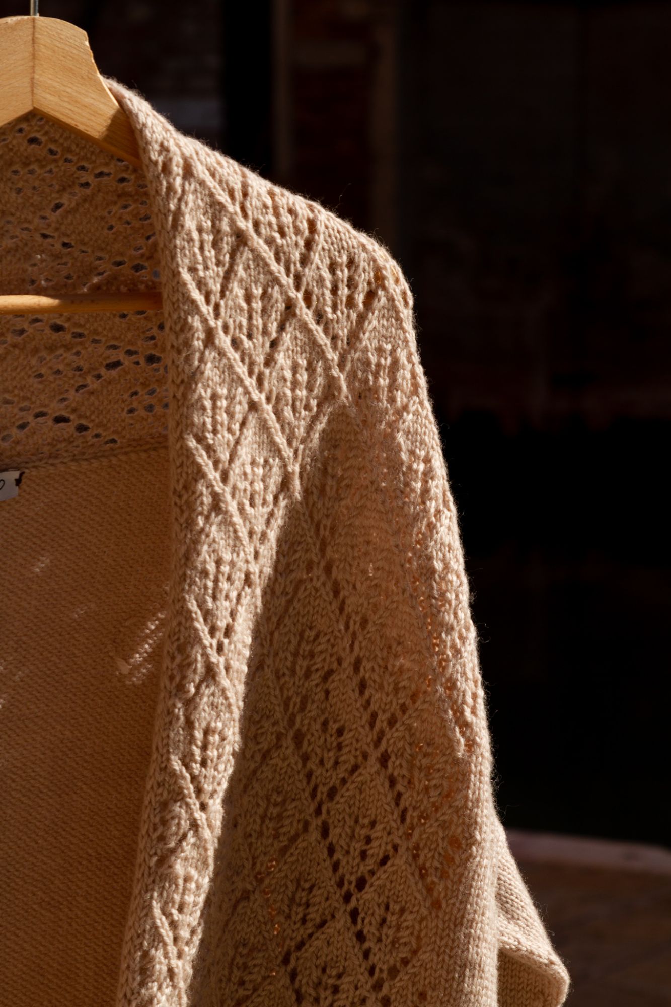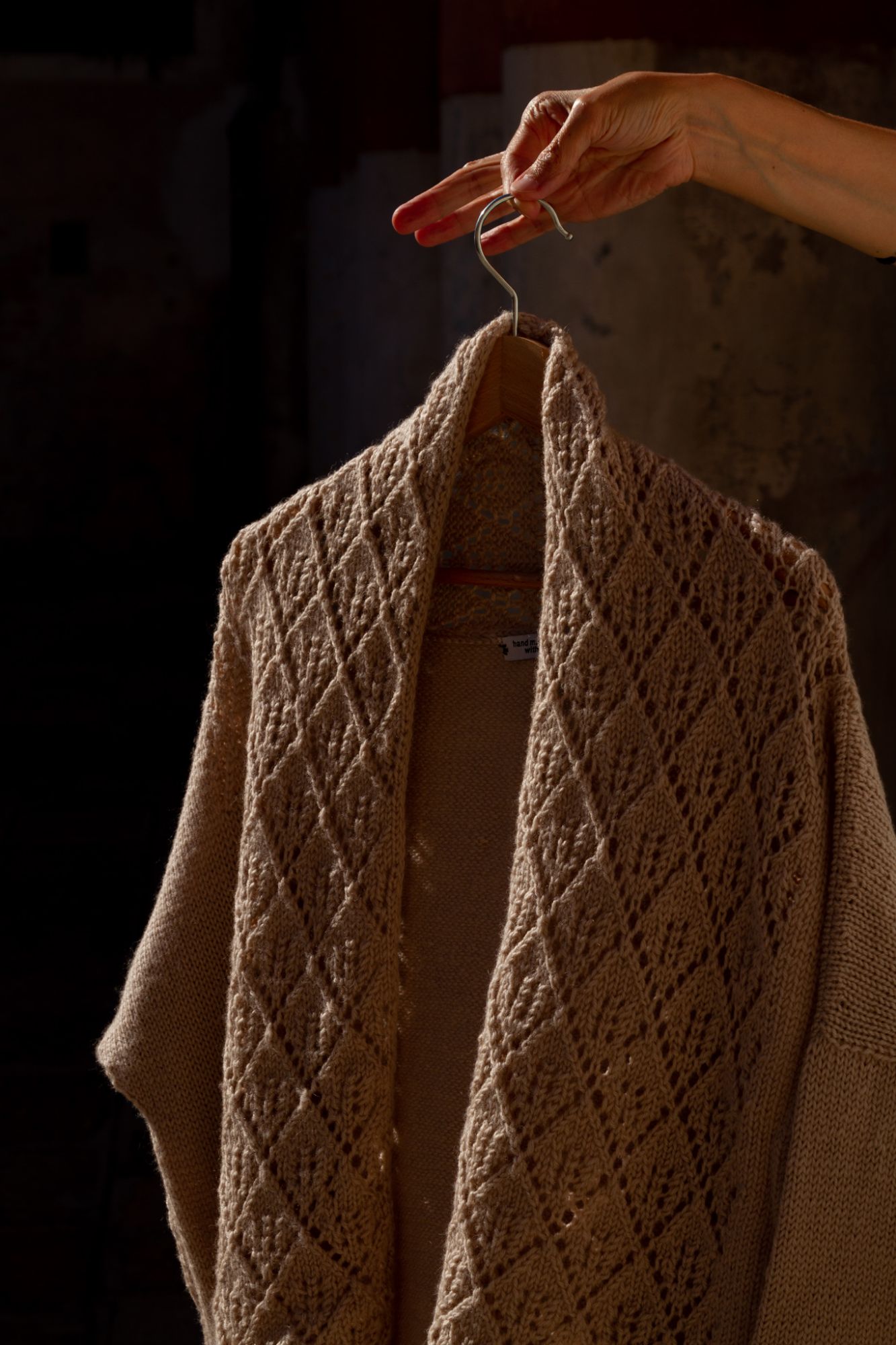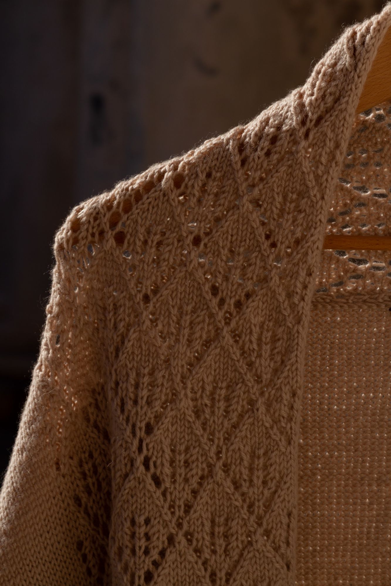 The Auchnaha cardigan features a fascinating construction method. It is knitted from the bottom up in one piece. When you reach the sleeves’ armholes, leave the back stitches on hold and focus on the front sections. At the shoulders, incorporate a set number of short rows, leave the shoulder stitches on hold, continuing to work only the lace panels that will wrap around the neck. Following this, pick up the back stitches and connect all parts using three needles bind-off method. Et voilà, the cardigan is done!