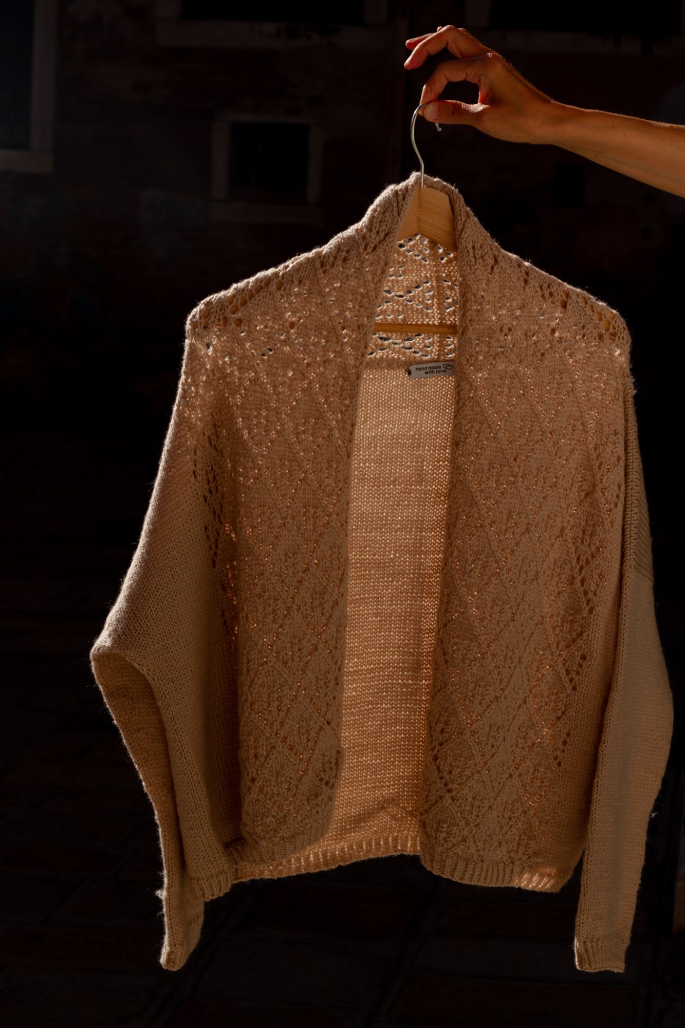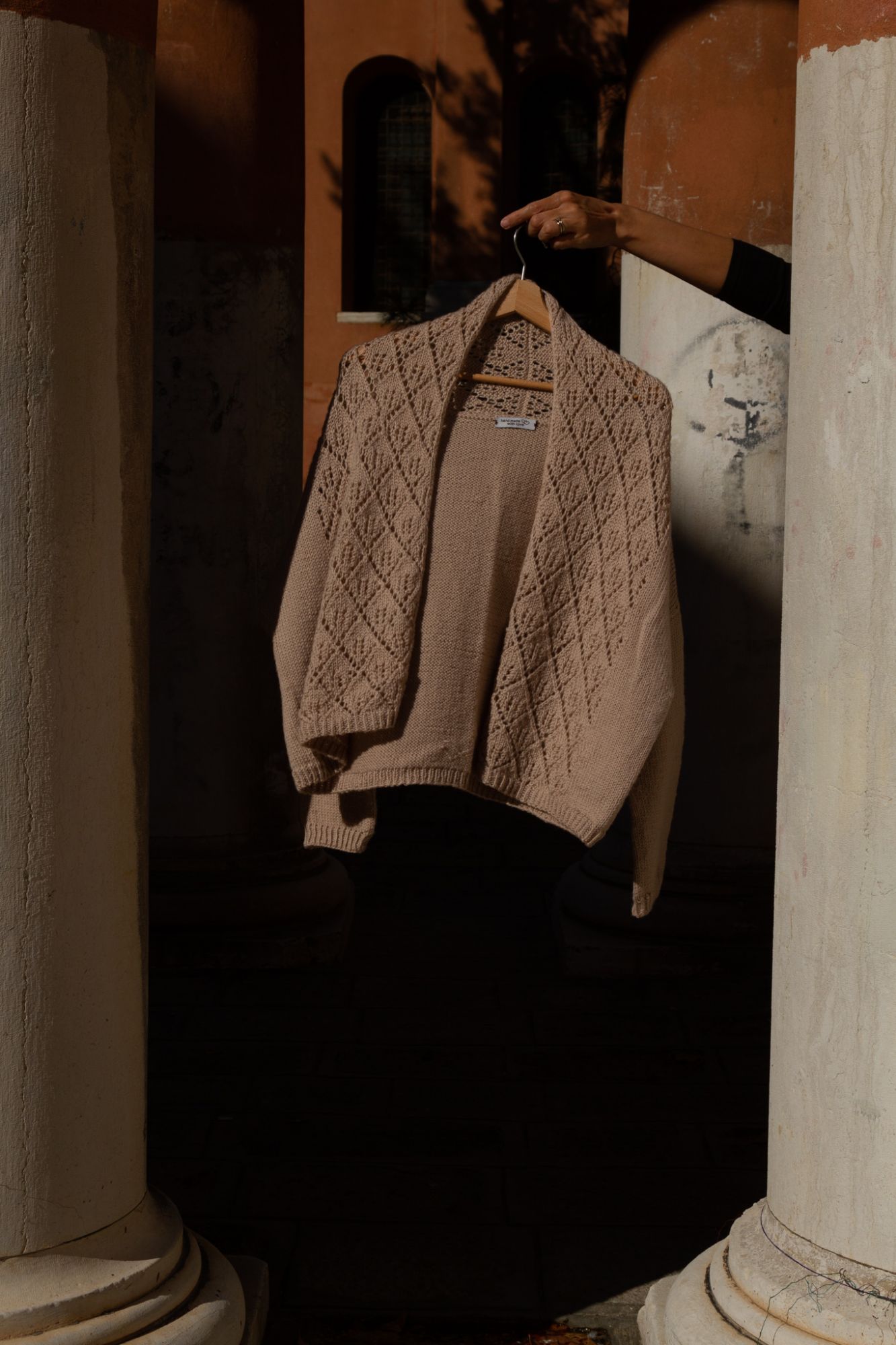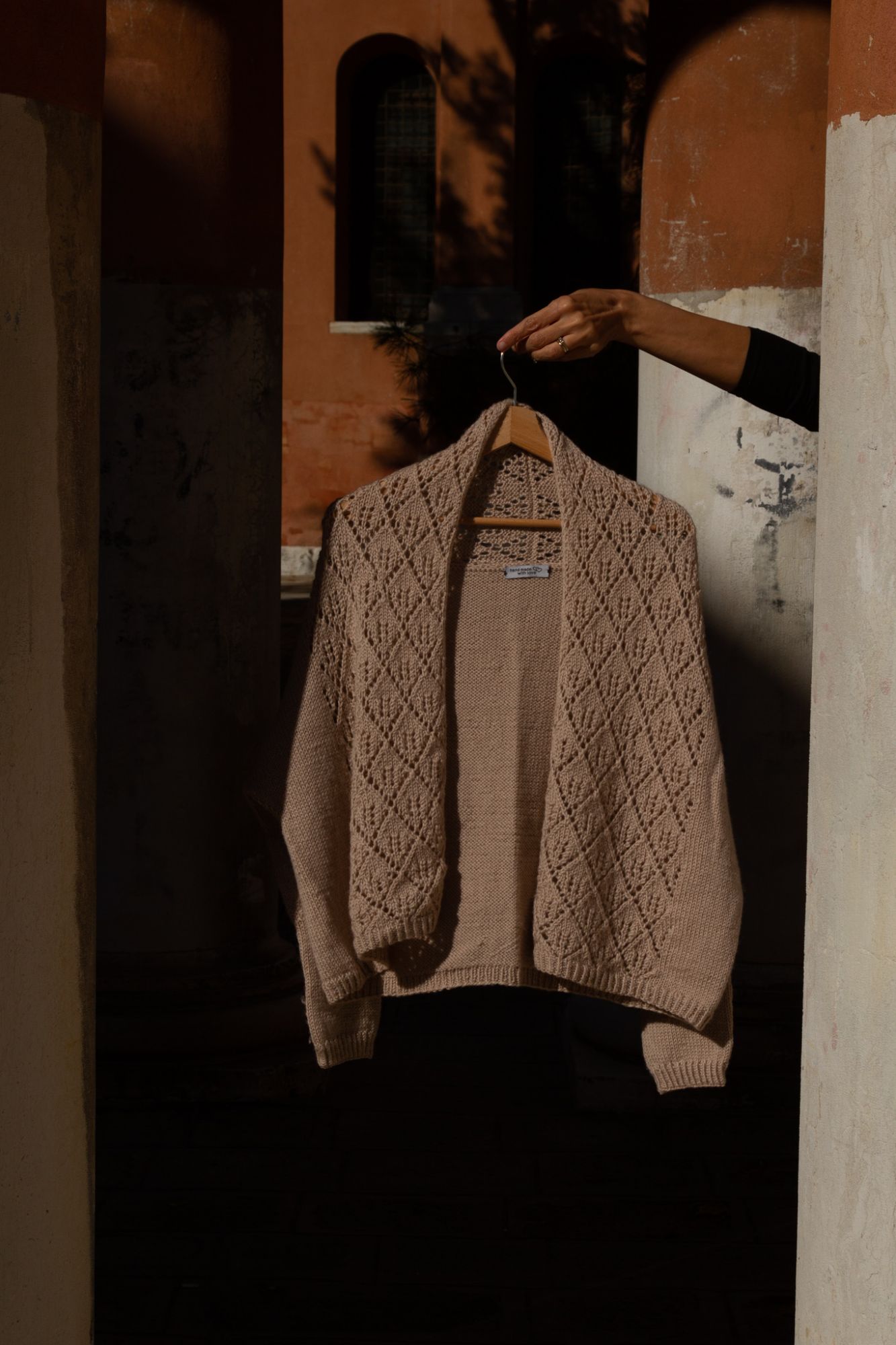 The intricate details of the cardigan come to life in the photographs, showcasing its rich texture and elegant design.