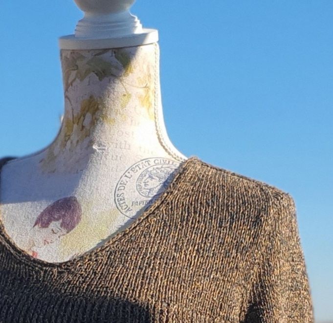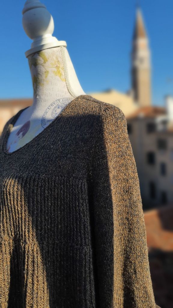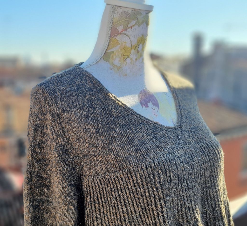 I chose this yarn for its softness, its slight mélange effect, and its ability to drape beautifully. The result is a pullover with a luxurious feel, with a play of light and shadow that enhances the beauty of the original pattern. The Kinu silk has given my pullover a unique depth.