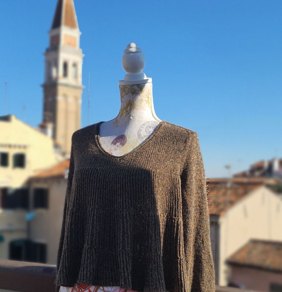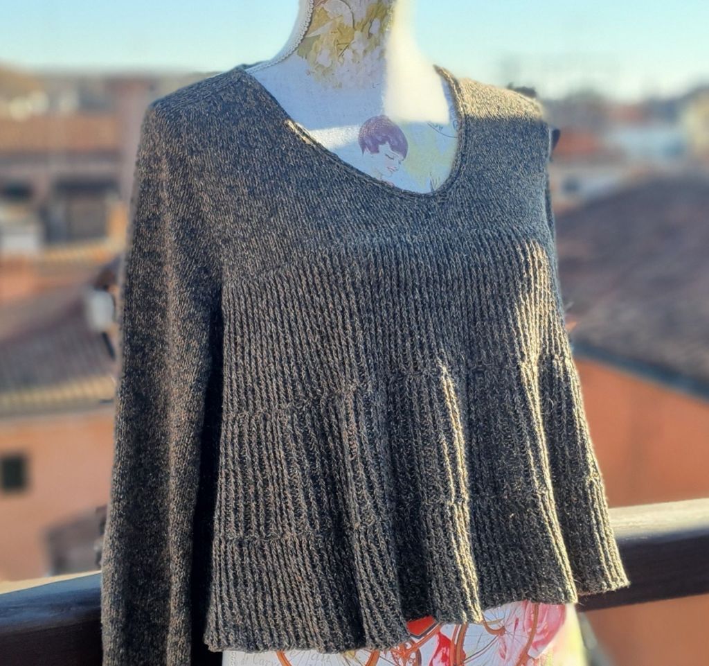 The Ruth Pullover can be worn with jeans, elegant pants, or skirts. The length is customizable: just be careful to do some calculations before moving on to the second block of twisted rib, before the increases. It can be paired with necklaces and earrings for a more sophisticated look and is a perfect piece for autumn.