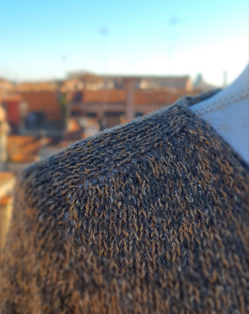 The twisted ribbing, which already creates a three-dimensional effect, is further enhanced by the slight irregularity of the silk fiber. However, its slightly rustic structure and lack of elasticity required some attention during the process. This pullover is knitted top-down with a contiguous method and has a V-neck finished with a small i-cord.